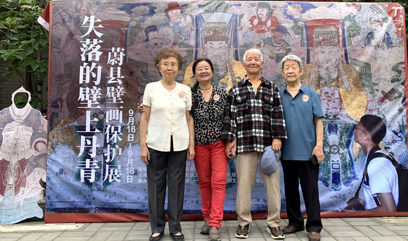 画家赵一唐夫妇(左、右),环保人汪永晨夫妇(中)参观蔚县壁画保护展。