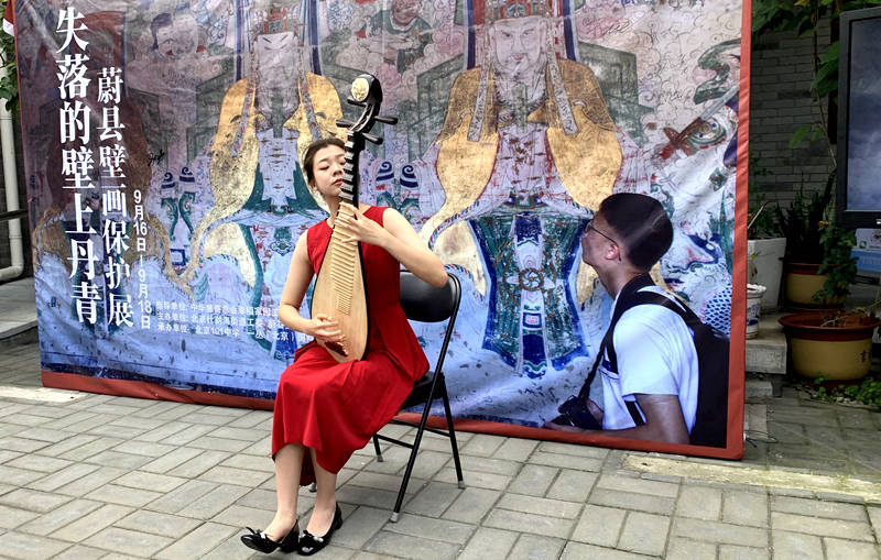 中央音乐学院教授章红艳特派学生薛元良为现场观众弹奏了《远方的客人请你留下来》《天山之春》琵琶曲。中国传统民乐与民间壁画在此交融,相得益彰。