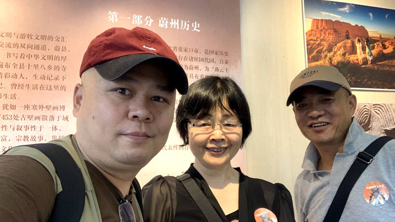 北京传媒人、诗人爱诺,中国社科院研究员沈红,书画家尚甘雨参观蔚县壁画保护展。