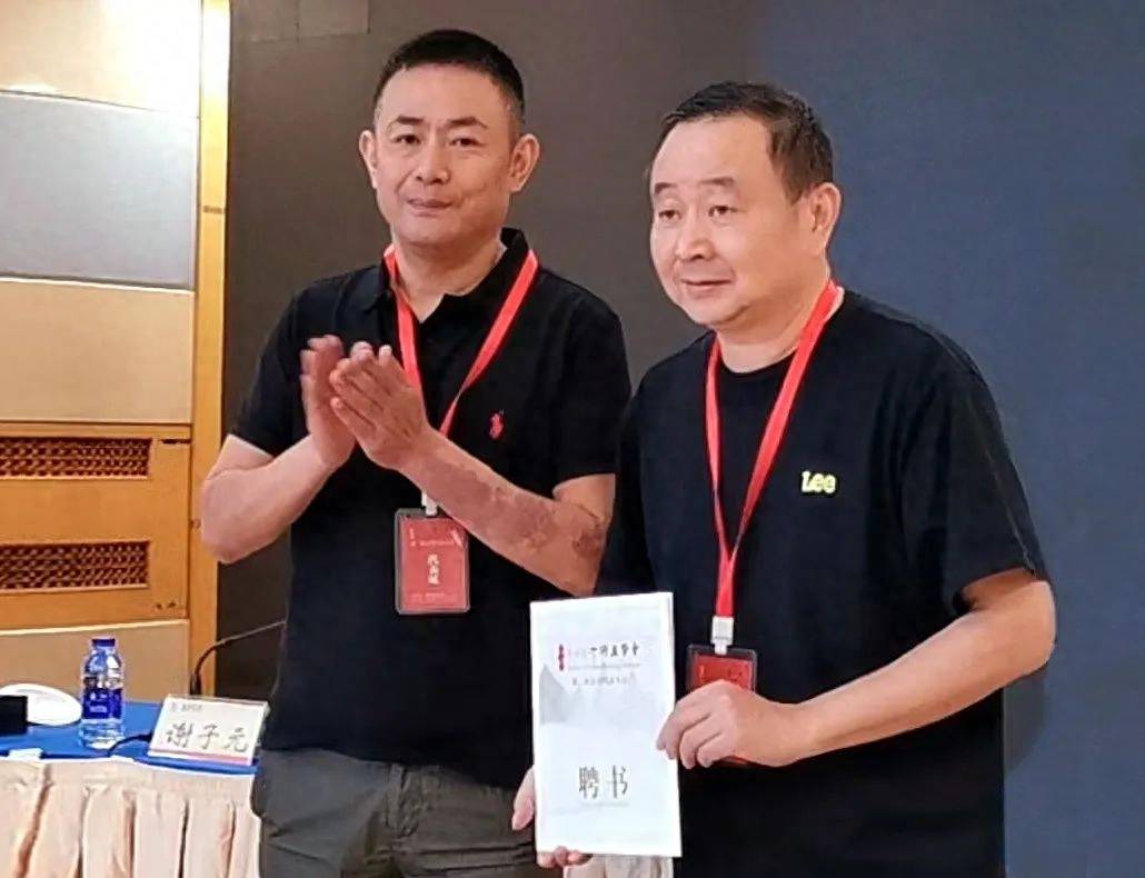 新当选的湖南省中国画学会第二届主席团主席石劲松为名誉主席石纲颁发聘书