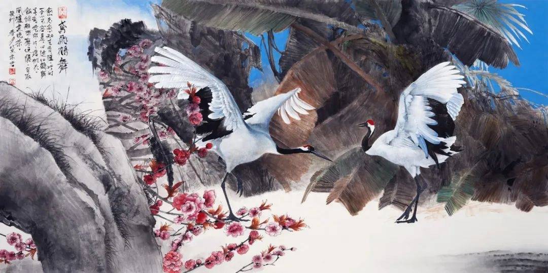 未君鸢飞鹤舞 68cm×137cm 纸本重彩 2023年