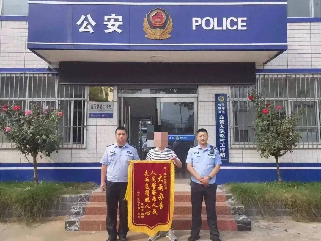 9月15日,群众孙某将一面写着“人民警察为人民,失而复得暖人心”的锦旗赠送给洛宁县公安局赵村派出所,感谢民警冒雨办案,帮其追回被盗手机。