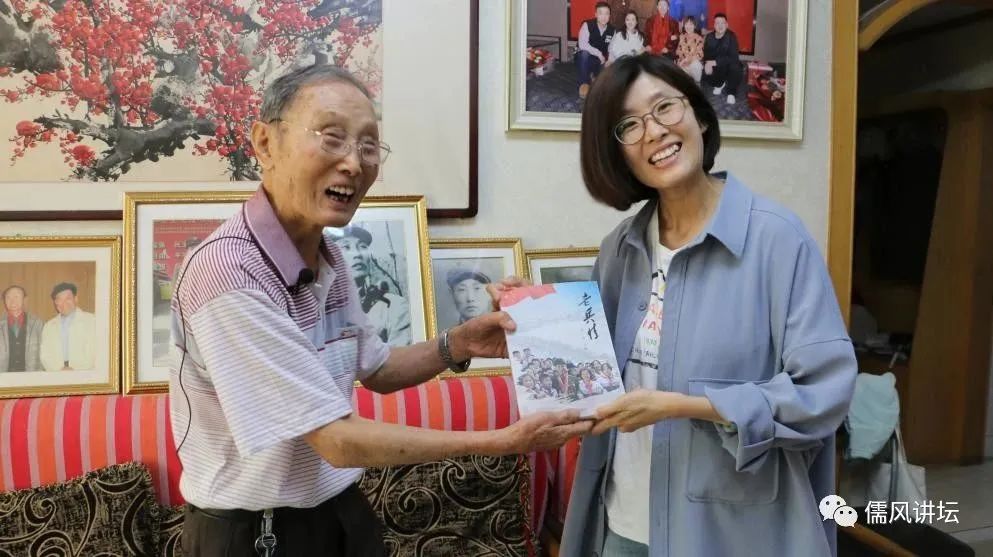 孙老签名向别晚晴记者赠书《老兵情》