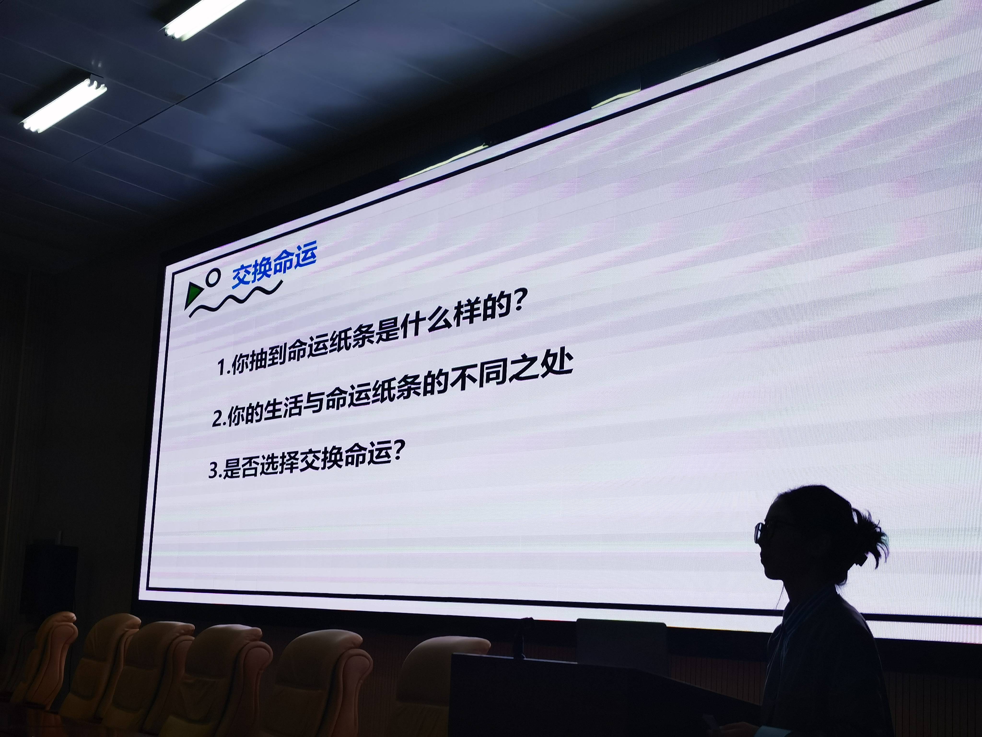 大多数学生反映对当下的命运不太满意。“那今天试试交换命运。”黄肖嘉棋话音刚落,第一排的女同学举手回答:“我觉得我不太满意,因为我爸妈总是当着我的面发生一些争吵。”但是,当黄肖嘉棋给他一个新的命运设定:你是一位刚荣获舞蹈大赛金奖的女孩,但是有口吃。这个设定让她去交换的时候,她立刻回应:“其实我不太想交换,因为我觉得虽然她会舞蹈并且拿了金奖,但是有口吃,而我至少表达能力、交友能力是不错。”黄肖嘉棋就这样化解了这位女同学对自己命运有点不满意的消极情绪。