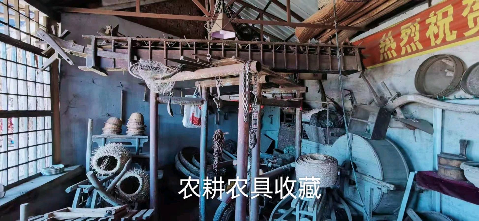 有民国初期的老式柜子、大高桌及家庭日常用品;有三条腿呶(nao闹)子、四条腿板凳、铁笊篱、筛子、簸箕、谷物风车。
