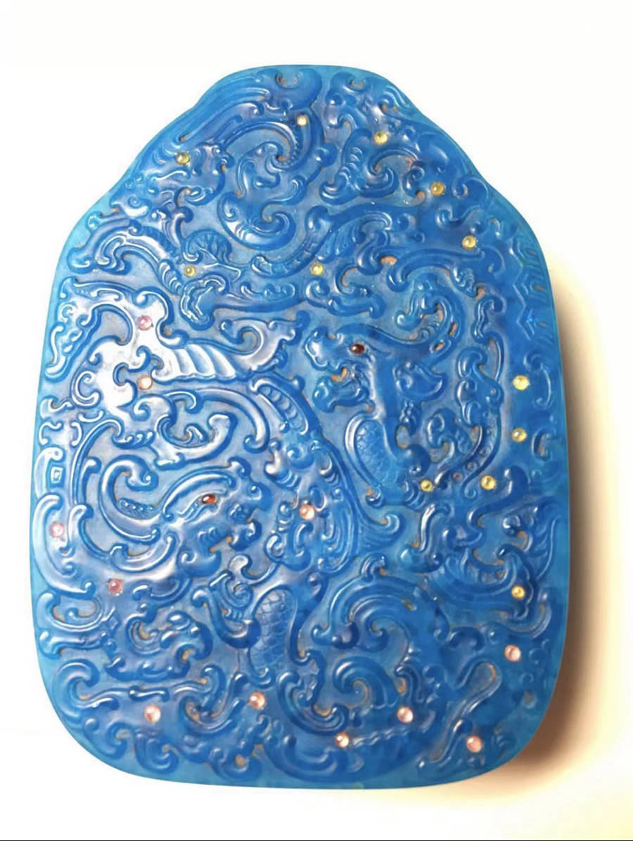 砚台是宫廷文房用具中比较常见的器物,古代书写过程中砚台必不可少。松花砚是四大名砚之一,清朝皇帝之所以推崇松花砚,把它列入四大名砚之中,一方面是对家乡物产的情结,另一方面更是松花砚的砚质和色泽都是砚中的上品。松花石的色泽,以杨绿最为上乘。此方雍正款松花砚是由共生色,黄绿两种颜色组成,非常难得,是砚中之珍品。而且为此砚定制的砚盒也是绝无仅有,更是玻璃器中的极品。此砚盒上下两层,由两种蓝色玻璃组成,下层是淡蓝色的玻璃料,看似半透明形状的结晶小颗粒,这种玻璃料在别的器物上从未发现,盖盒最上面是一层薄薄的深蓝色,上面雕刻夔龙夔凤纹,在龙凤纹上还镶嵌各种颜色的碧玺,图案雕刻极其精美。在玻璃器上雕刻镶嵌宝石的工艺,更是绝无仅有,是雍正皇帝审美的极致表现。雍正带款的玻璃器存世量本来就稀少,且大部分是单色玻璃,像这样带款带雕刻带镶嵌的器物,在整个清代玻璃器中也是独一无二,可谓稀世之珍。