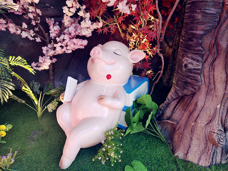 章小福,是一只体长73.9米、宽16.8米、高13.5米、体重达200多吨的大猪。它活灵活现地俯卧在那里,占地2亩多,相当于4层楼高。它通体粉红,健康丰满,憨态可掬,人见人爱。