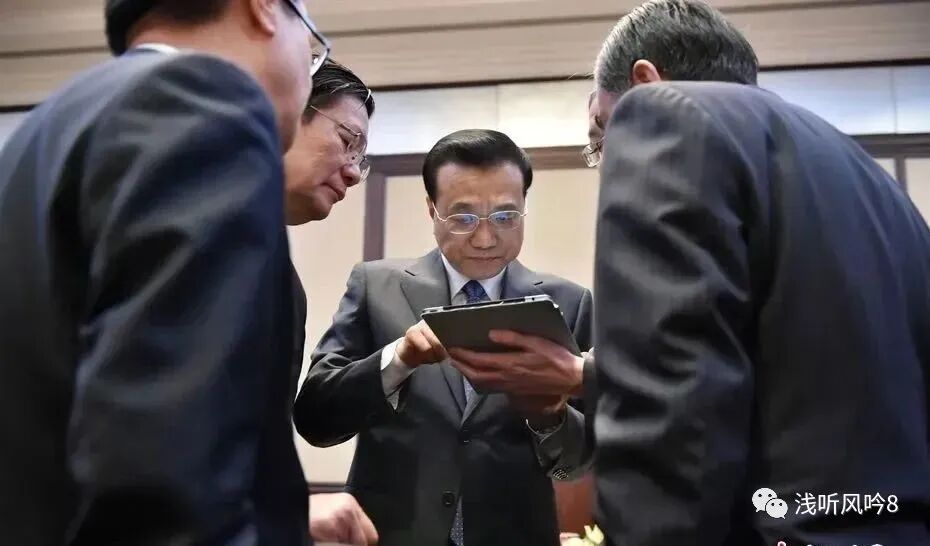 周行长手捧ipad,总理及几位部长饶有兴致地围观。