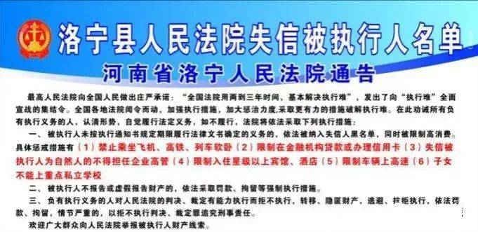 本期是洛宁法院失信被执行人曝光台。欢迎社会各界转发扩散,为构建诚信洛宁贡献自己的力量。 同时,洛宁法院提醒您,在与他人发生经济往来前,请务必查询对方是否被列入人民法院失信被执行人名单,以免遭受不必要的财产损失。(本期失信人名单如有已履行义务之人,请下方留言告知,以免造成不必要纠纷)(请勿私自转载)