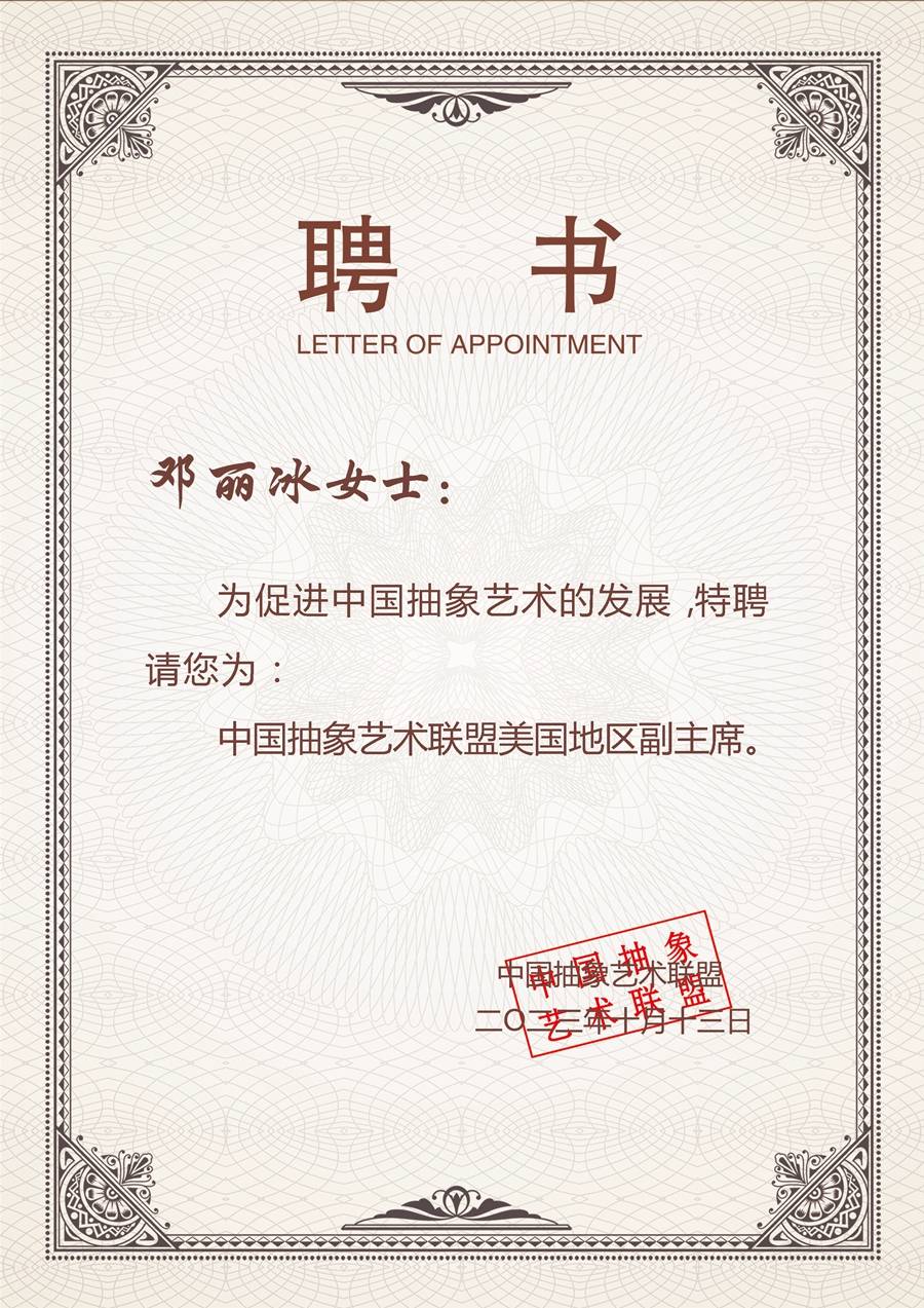 二〇二二年十月加入国际书法艺术家联合会成为会员。二〇二三年三月应邀参加当代世界华人女艺术家学术邀请展,同年七月有四幅作品被刊登在《中国日报》世界华人周刊上,最近《大湖文艺》刊出我的多篇诗歌和画作,《北欧诗刊》采用我的画作为该刊封面。