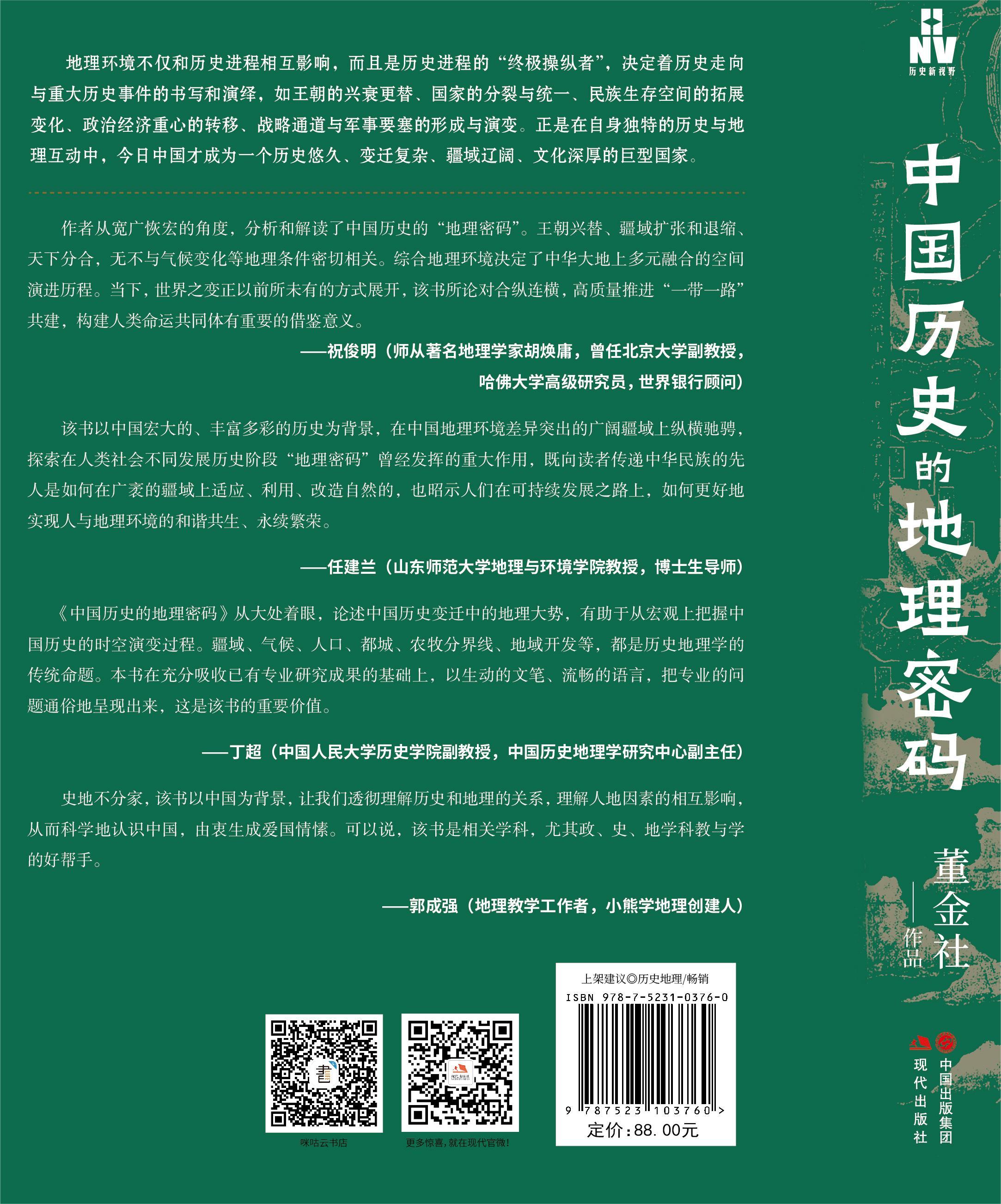 面向社会大众,传播正能量的新书《中国历史的地理密码》由中国现代出版社出版并发行了。在中华民族伟大复兴,传统优秀文化创造性转化,创新结合的当下,有非常重大的意义。最近批准通过的《爱国主义教育法》,号召全国人民理解中国历史和地理,当一个合格的国民,更是应时之需。今简要介绍,并推荐之(购买链接:《中国历史的地理密码》(董金社 著)【简介_书评_在线阅读】 - 当当图书 (dangdang.com))