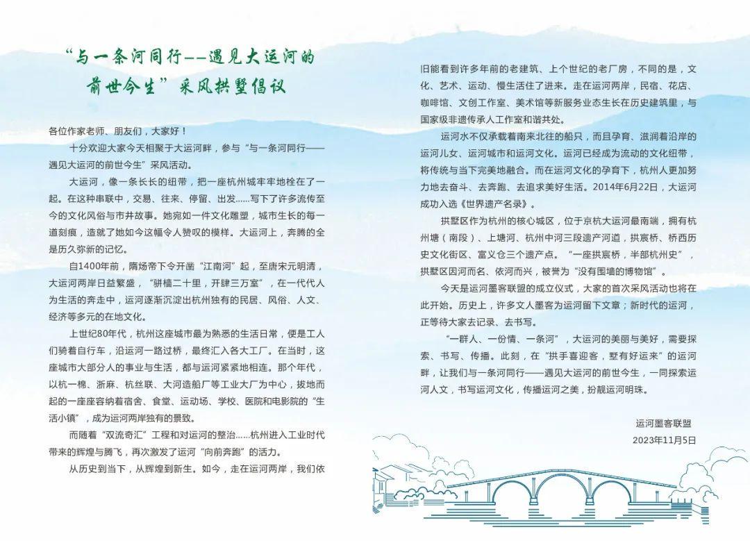 11月5日下午,在京杭大运河南端祥符桥传统风貌街区正式成立“运河墨客联盟”,联盟将在杭州市拱墅区大运河文化带管理办公室的指导下,紧扣“一群人、一份情、一条河”,聚焦大运河文化的可感、可知、可见、可繁衍,用文字记录运河文化传承故事,持续激活传统与现代的联通,用心用情传递运河故事、中国气度,让书写大运河成为一种社会风尚,让流动的文化浸润到每个人的心中,让大运河的文化地位、地标形象更多彩醒目,积极参与全球开放传播与交流。