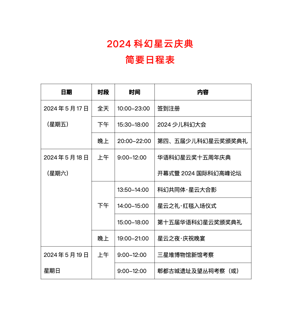 2023年11月16日下午,第四届少儿科幻星云奖组织委员会主席团召开扩大会议,听取了2024科幻星云庆典执委会主席董仁威、甘伟康,主席助理董晶,宣传总监石以,秘书长阿贤等通报的关于明年活动的相关事宜,决定2024科幻星云庆典于2024年5月17日至19日在成都科幻馆举办,其中,2024少儿科幻大会于17日举办。