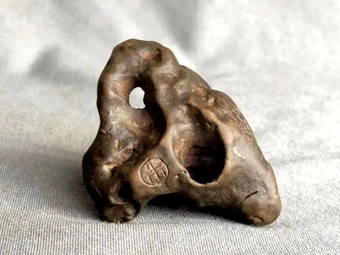 石头上手感觉很轻盈,长时间把玩形成的包浆铜色一样苍古。石头有6厘米大小,造型不规整却极为圆润。石头多角度可赏,审美变幻奇奇怪怪。大自然奇绝奇巧之美,浓缩在了不足一拳的石头之上。
