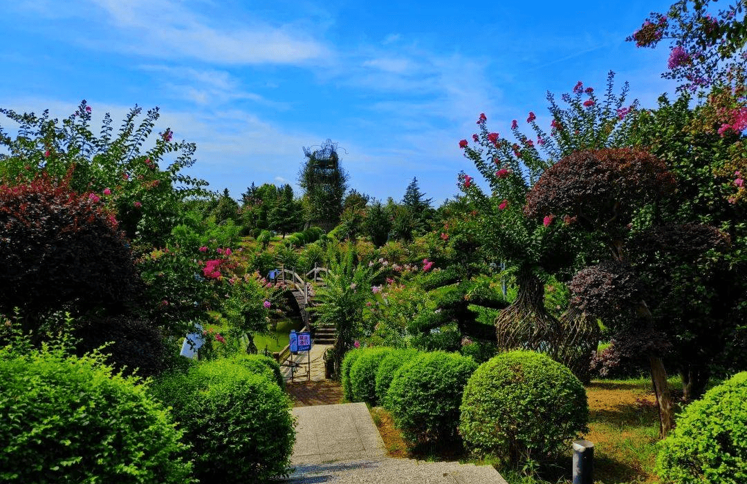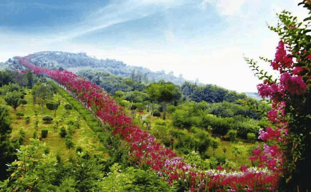 两条总长度2600米、由活体紫薇扎制成的巨龙盘旋在高高的山脊上,龙头交汇于山顶波光潋滟的紫薇湖,"岳麓书院"、"桃花源"、"芷江受降坊"等全省标志性建筑,全部汇聚博览园,均由活体紫薇扎制而成,令游客叹为观止,流连忘返。