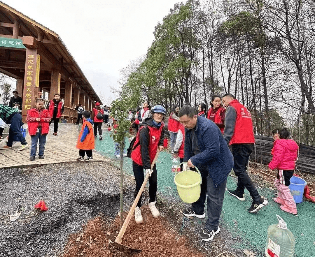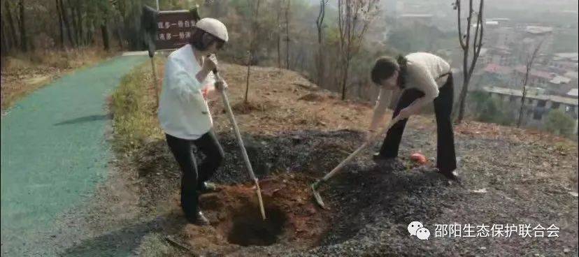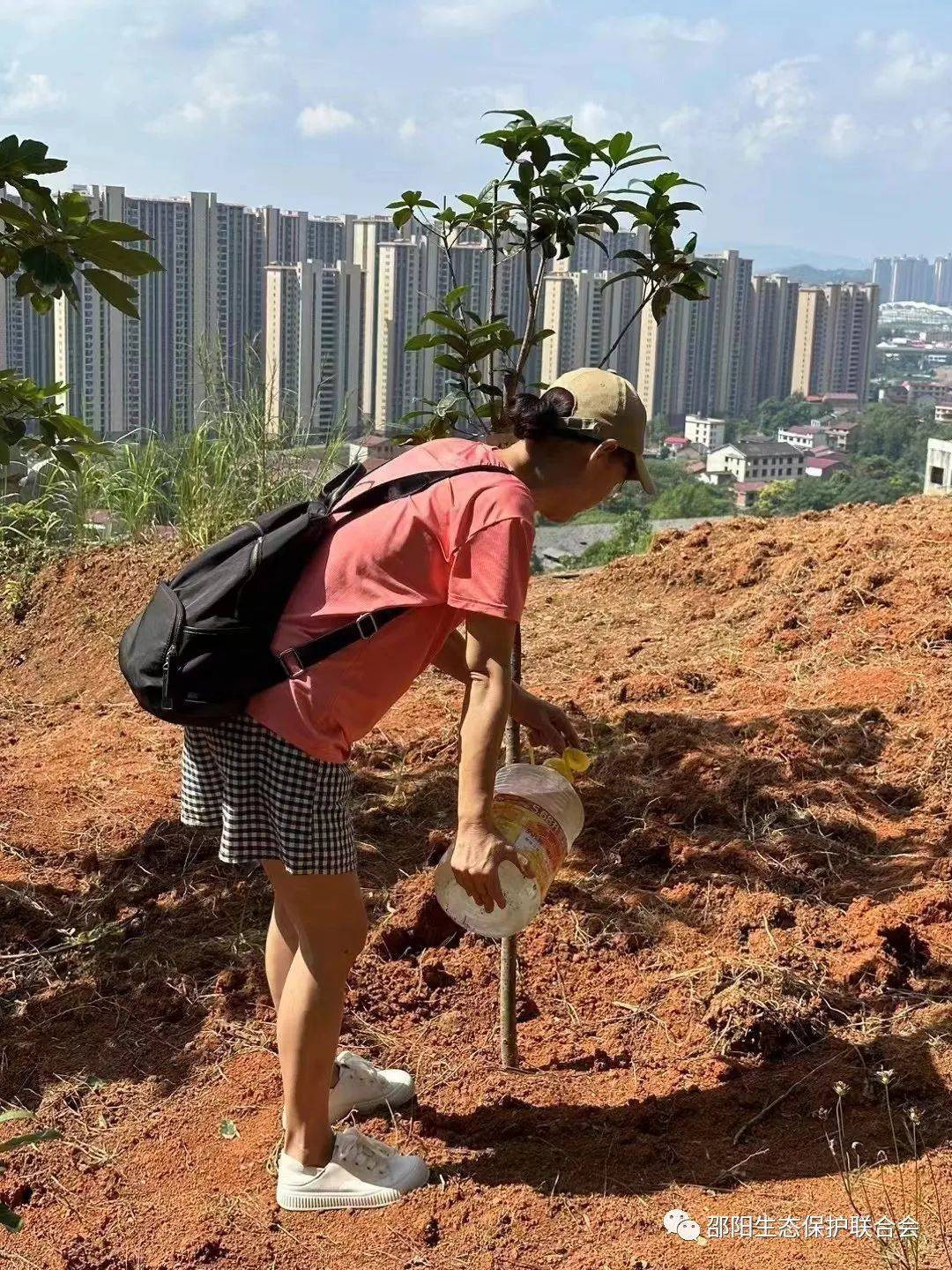 在邵阳佘湖山,有一片生态景观公益林,全程由邵阳市生态环境保护志愿者联合会志愿者们打造并维护,"生态美家园美大美邵阳,公益心公益行天下为公。"