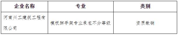 根据《建筑业企业资质管理规定》(建设部令第22号)、《建筑业企业资质标准》(建市[2014]159号)和《建筑业企业资质管理规定和资质标准实施意见》(建市[2015]20号),《住房和城乡建设部办公厅关于建设工程企业资质有关事宜的通知》(建办市函〔2022〕361号),《河南省住房和城乡建设厅关于建设工程企业资质有关事宜的通知》(豫建市〔2022〕276 号)等有关规定,决定对以下一家建筑业企业专业承包资质予以撤销,公示期为2023年11月22日至2023年11月28日。