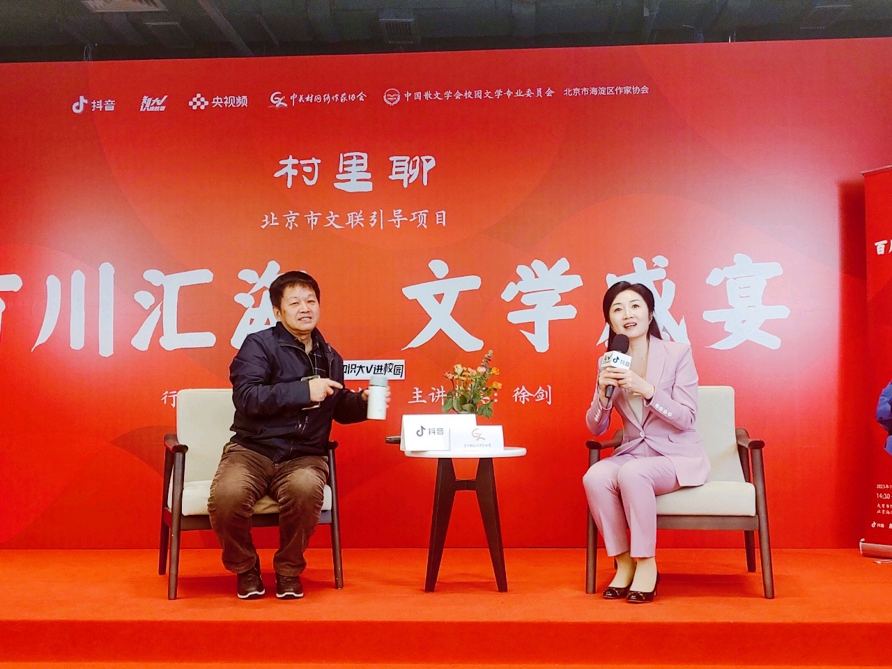 古语云:“读万卷书,行万里路”。行走与文学有着什么样的深层隐秘联系?这是文学史上一直为人们孜孜不倦而好奇探究的话题。2023年11月25日,2023年北京市文联品牌活动引导项目“百川汇海·文学盛宴”第四期在中共中央党校(国家行政学院)大有书馆开讲。活动与抖音知识大V进校园合作,以“行走的无限与文学的边界”为主题,邀请到了著名作家、中国报告文学学会会长、鲁迅文学奖获得者徐剑为主讲嘉宾,金天为主持嘉宾,开讲报告文学创作的相关话题。北京海淀区及相关区作家、文学爱好者共计百余位观众参加活动,抖音线上60多万观众收看了直播。