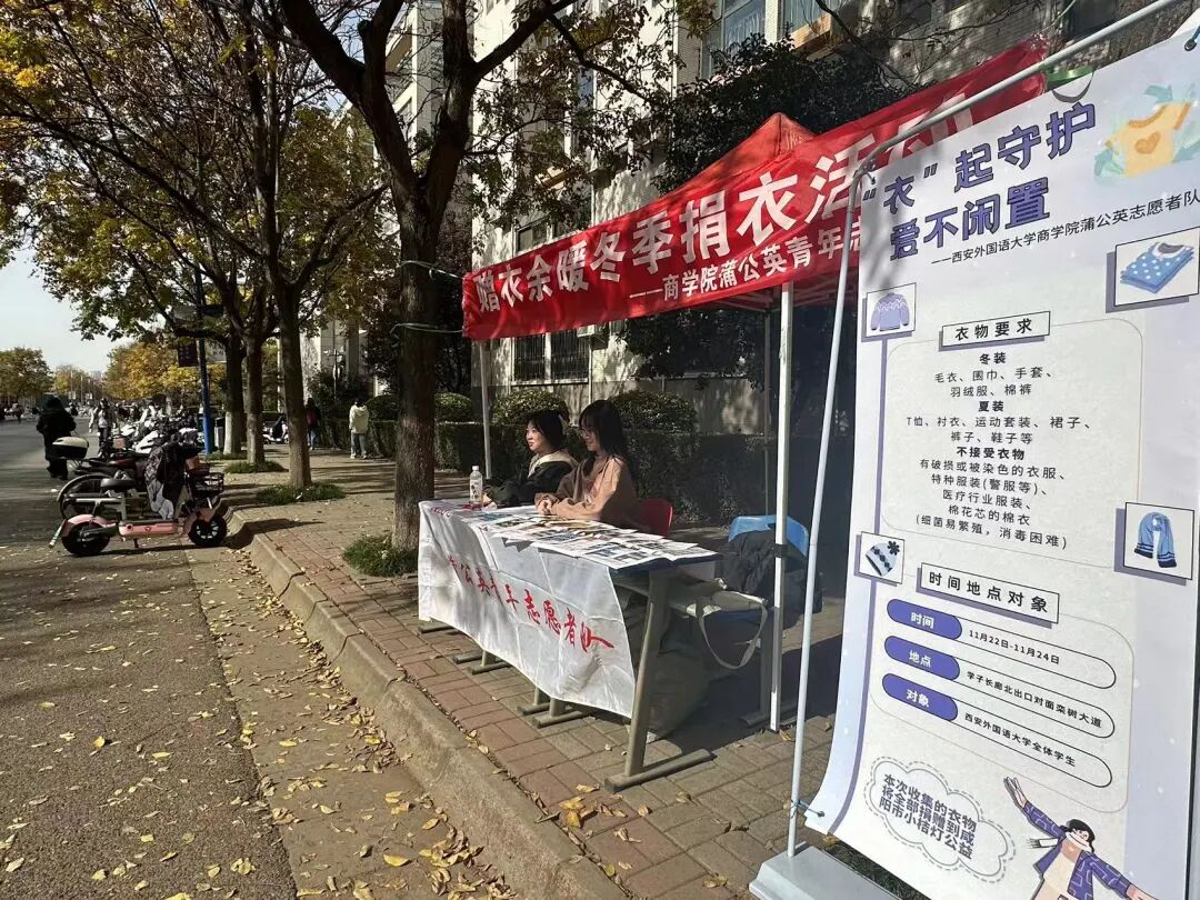 11月22日—24日,西安外国语大学商学院蒲公英青年志愿者队在校园内举行了主题为“衣起守护 爱不闲置”的闲置衣物募捐活动。