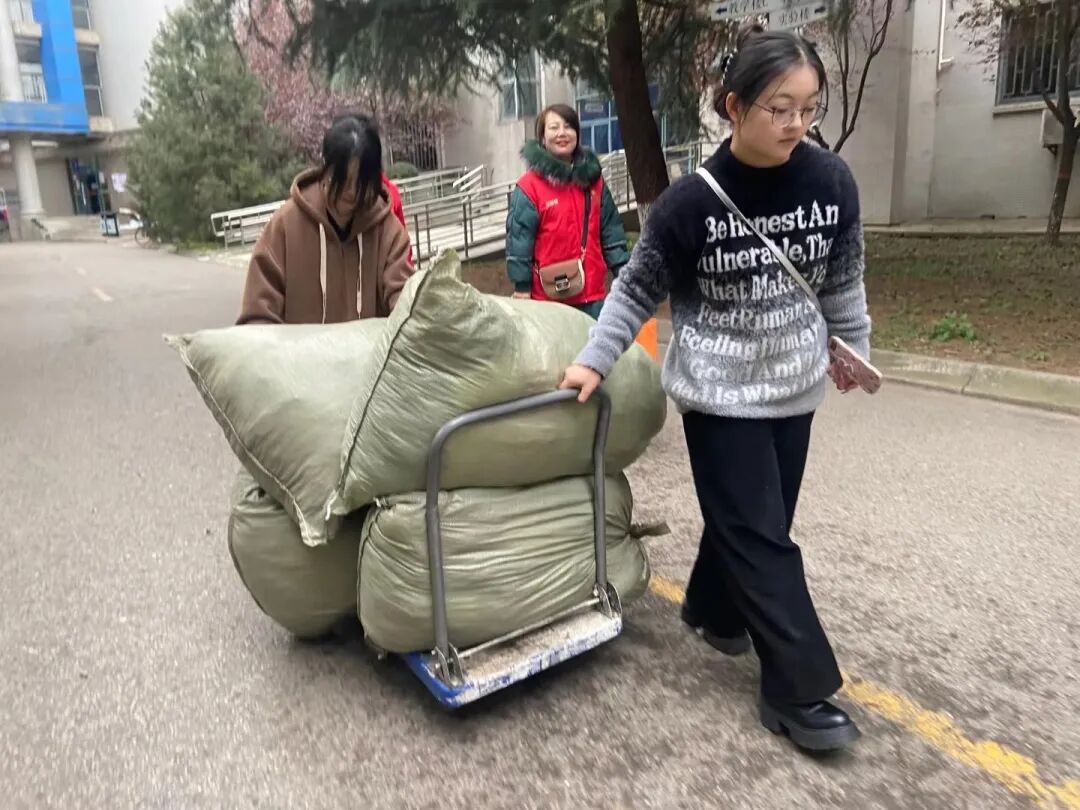 因为车辆无法进到教学楼,同学用板车将衣物运送出教学楼外进行装车。大学生与志愿者齐心协力将衣物装上车。
