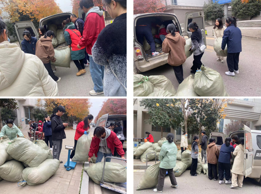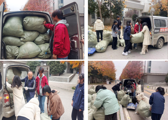 11月25日一早,志愿者刘媛、路爱利前往西安外国语大学接收捐赠衣物。