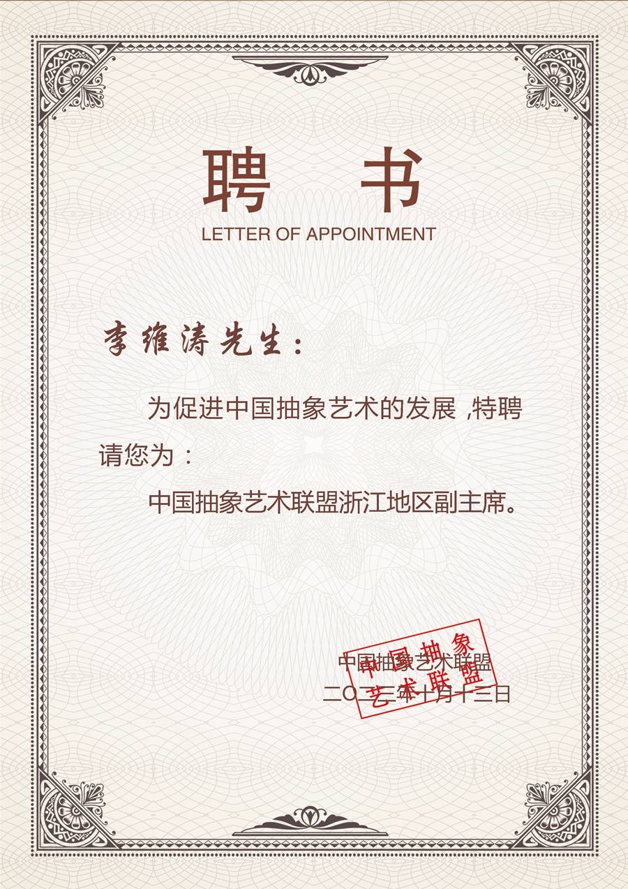 中国抽象艺术联盟浙江地区副主席。