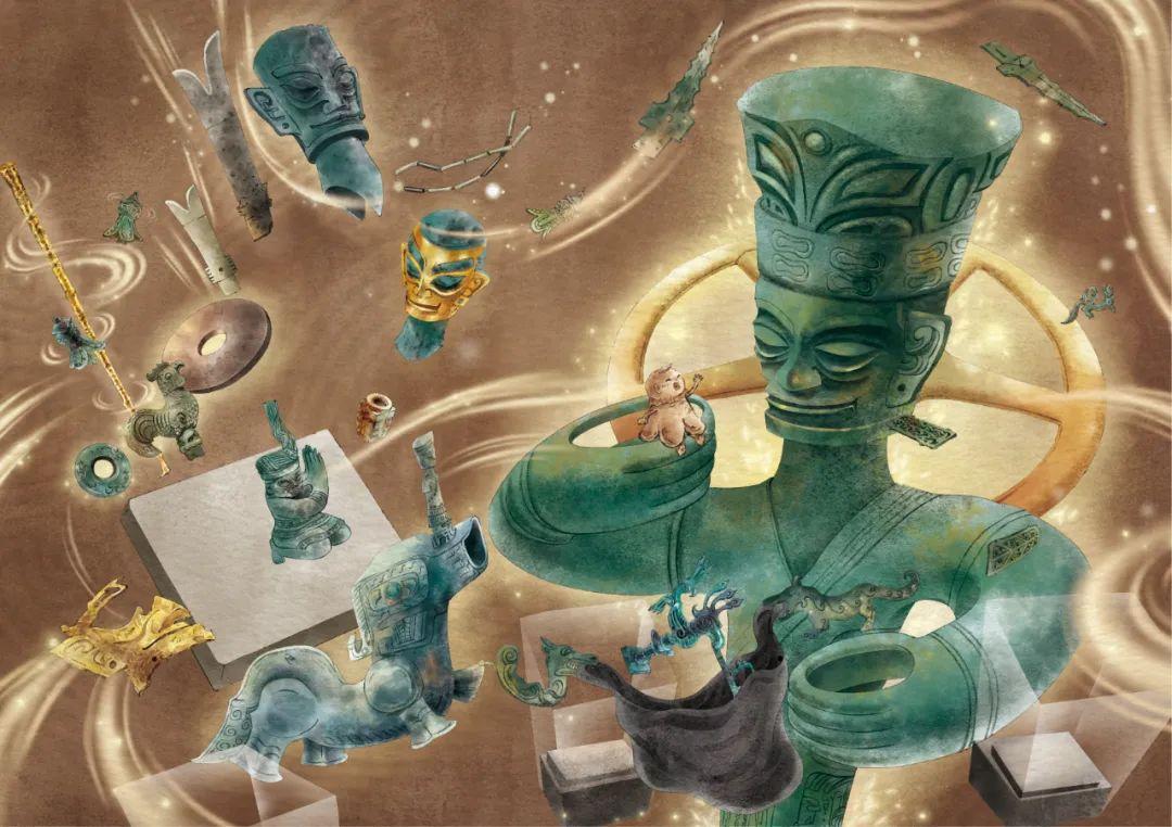 在堆堆这一形象身上,呈现了契合物性的、生动的童话想象。用来放松的“泥巴操”、堆堆的“咒语”及变身过程都写得俏皮童趣,很有画面感,寓庄于谐。作家还为角色赋予了不少巧思,比如俗语中的“惊掉了下巴”,在小泥人身上得以轻松实现。堆堆和它在古蜀国的好朋友——青铜小立人身上,都有着“顽童”的气息,与盛大的祭祀场面描写、气宇轩昂的大立人等大型青铜器形成了鲜明的对冲,让崇高威严变得很接地气。同时,这些大型青铜器也是情感细腻的,它们虽声如洪钟,但面对堆堆和小立人时,又是轻声细语、呵护有加的。作者将青铜世界复原为一个有生命的世界,鲜活的气息扑面而来。