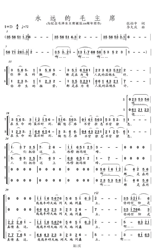 张怡中 祖籍湖南 现居北京。退休后学写诗歌,有“人民三部曲”(作词)《永远在一起》(央视频)《天地情义》(“北京时间”)及本歌曲创作完成。《尊重》《一条大路中国道路》等6个诵读和诗朗诵+歌曲作品登“古塔”上“头条”。