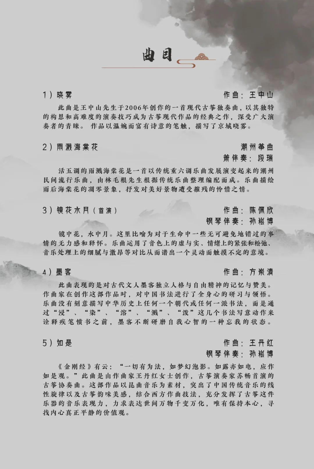 陈佩欣,自幼随吴节皋老师学习音乐,2008年起师从古筝演奏家周茜老师学习古筝,并得到中央音乐学院周望教授的指导。2018年保送到中央音乐学院,师从古筝演奏家苏畅副教授至今,在校期间获院校颁发港澳及华侨学生奖学金特等奖、优秀学生奖学金及三好学生奖等。2019年起师从中国音乐家协会主席叶小纲教授学习作曲。2022年以港澳台考生第⼀名成绩录取中央音乐学院研究生。