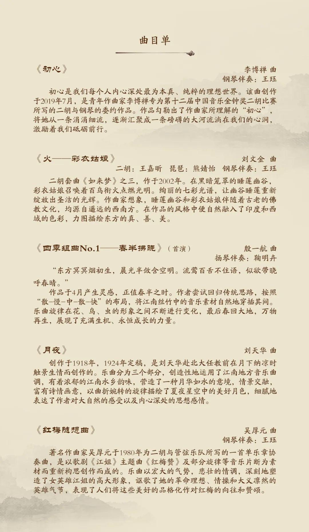 殷一航,中央音乐学院民乐系研究生,师从朱江波教授。2016年以专业第一名的成绩考入上海音乐学院,师从邢立元副教授,2021年考入中央音乐学院研究生部。曾获第四届新加坡南洋国际音乐大赛二胡高级专业组杰出金奖第一名。2023年创作并首演了二胡独奏曲《塔什古丽》,获得一致好评。