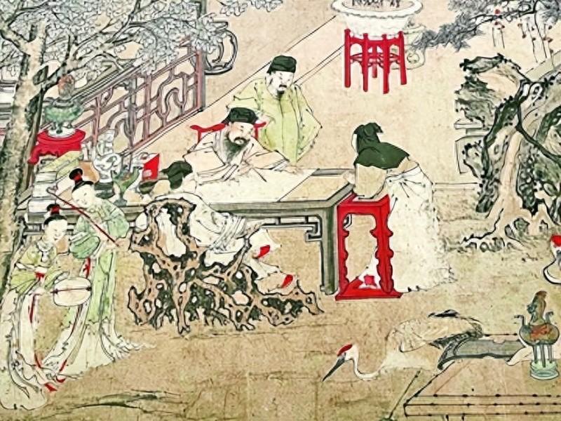 在明代王式的《西园雅集图》(局部)中,苏轼头戴东坡巾,正伏案提笔书写。资料图片