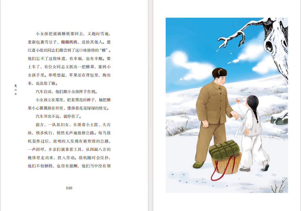作家的文笔表意简练而准确,三字的章节名中,既呈现了四季的轮转,也烘托了每一时段故事的基调。开篇寥寥几笔,即是一幅东北冬天的地域气息,火炕、炉火、凛冽的寒风。接着巧妙一笔,单明和同学们在学校礼堂里一起收听开国大典的实况广播,时代背景清晰地指向1949年,人物的身份也由此明确,新中国成立以来第一批“师范干训班”学员。这样简练、自然的远景勾勒到具体聚焦,将故事的主要因素都做了清晰交代,实属难得。美帝发动侵略朝鲜战争,战火烧到了鸭绿江边,志愿军出兵,跨国鸭绿江,抗美援朝战争打响。