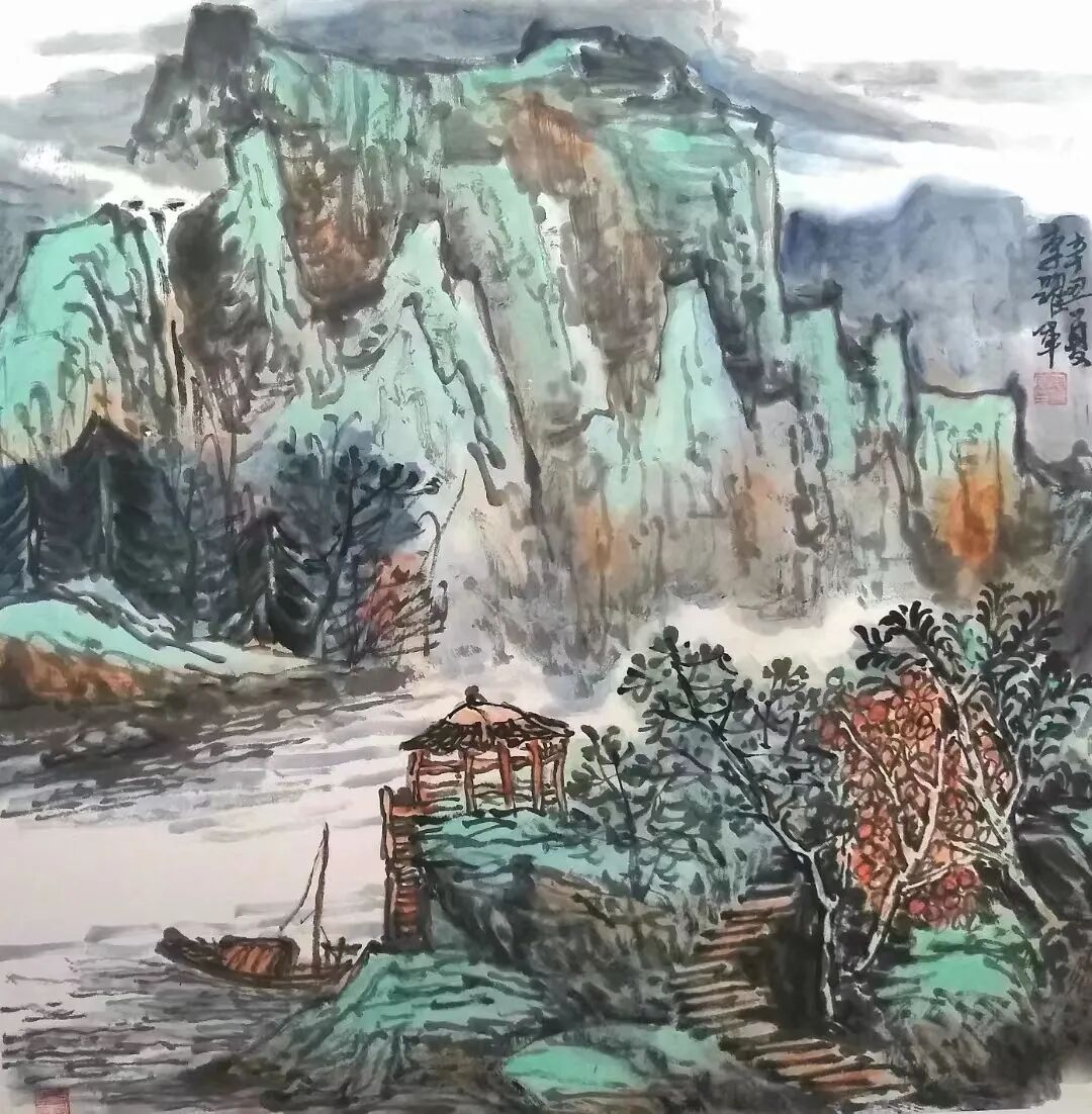 天赋异禀固然重要,但后天的勤奋努力也不可或缺,必须有师承。拜师学艺得到“高人”指点,将是每位画人步入绘画艺术殿堂的必由之路。他最为得意,收获最大的时期,是十年前中国检察官文联的成立。高检文联书画院经常组织采风研讨活动,这让李跃军有了走出汉中盆地的机会。他珍惜每一次赴京学习之机,与国内画界许多大师大家相识,从而扩展了自己绘画的视野和眼光,提升了思想境界和艺术鉴赏能力,对于其后绘画创作实现“质”的飞跃起到了决定性作用。2015年夏天,经朋友举荐,他有幸与著名画家王中年先生结缘,从写意花鸟画,跨进了山水画的领域。国画有人物画、花鸟画和山水画三大层面,而“山水画”则是国画中最为丰富的画种,它涵盖了花鸟、人物画的技法和内容,对画家的思想境界和笔黑要求更高更综合。李跃军拜王中年先生为师,两年时间进修山水画,取得长足发展。期间还到“艺术家的天堂”北京宋庄,去寻觅绘画艺术灵感。脚步所至,皆有所获。2011年秋天,他的一幅国画《赏秋》,荣获庆祝建党90周年全国书画名家邀请展“金奖”。至此,小城汉中李跃军便在全国美坛斩露头角。在“北漂”学艺期间,又通过高检文联结识了国画大师范扬先生。师从范公受益匪浅,也成为他绘画生涯的重要转折。他痴迷于画山水,使自己进入更加复杂、更加摇曳多姿的新天地。关于山水画,董其昌有名言:“以境之奇怪论,则画不如山水。以笔墨之精妙论,则山水决不如画”。由此可知,山水画,是画家贴近自然,氤氲山川,积聚天地灵气之后的再创造。所以,石涛有云:“搜尽奇峰打草稿”,故,好的山水画作,绝不是风景,它是高于现实中“最美的风景”的。在北京,李跃军随恩师范扬先生到天津盘山、安徽黄山、宏村等地写生,零距离看老师如何看待眼前的景物,然后又怎样在画纸上去表现。令他感动和惊奇的是,范老师去画一根电杆上缠绕那么多毫无关联的电线。这种场景在我们学员的眼中,却不屑一顾,视而不见。