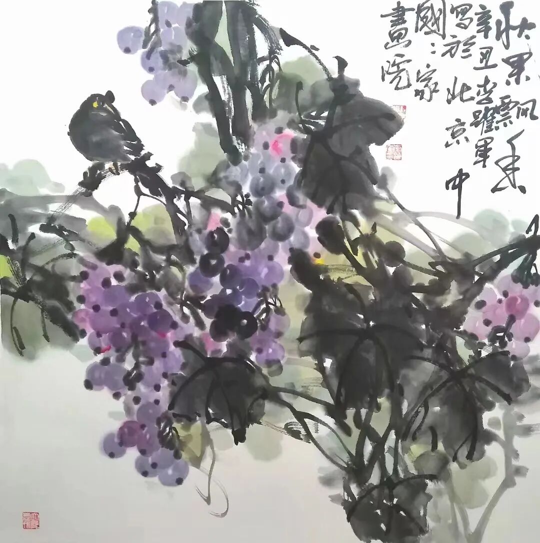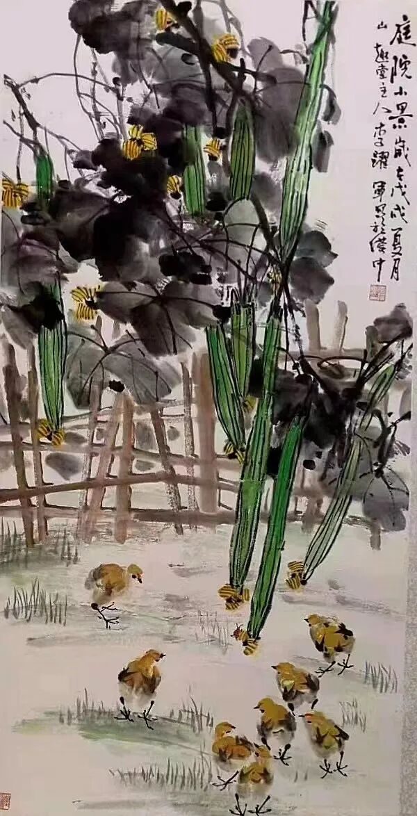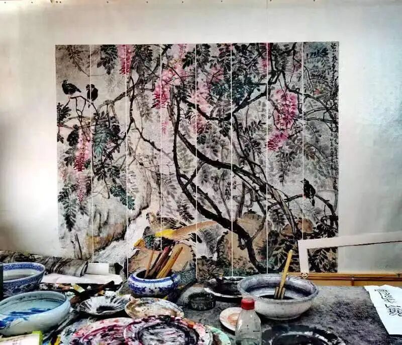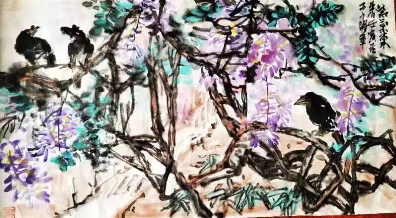 李跃军先生的国画语言丰富、张力很大,不囿于一面一色,一目了然,而善于在制造矛盾中去解决矛盾。他的花鸟画,不是单独去画好一只鸟,或一种花,常常是一丛花,在看似很乱的花花草草间,有主体主干,构成主要矛盾,使画面不至于单调,再以丰富的绘画语言,去勾勒、描绘、覆盖、晕染、调色,形成浓烈的现实感,然后,在画眼位置上画上一两只小鸟,或静或动,或栖或飞,点缀其间,使一幅画产生出极高的艺术美感。如若伫立于李跃军先生的画作前,定然使你“深陷”其中,看得出神入化。他的花鸟画,水墨淋漓,笔墨大气磅礴,犹如“白石虾”的功力,追求画面自然天成之美。他执着于画,潜心研究绘画的本源,在任何地方都绝不炫技,而媚俗地去“画”一幅画。即是在各种笔会现场,他都会沉浸下来,潜心构思,做到胸有成竹,而后认真创作,绝不随意涂抹,敷衍了事,永葆一位画人的基本态度,这也是诚实做人的根本所在。
