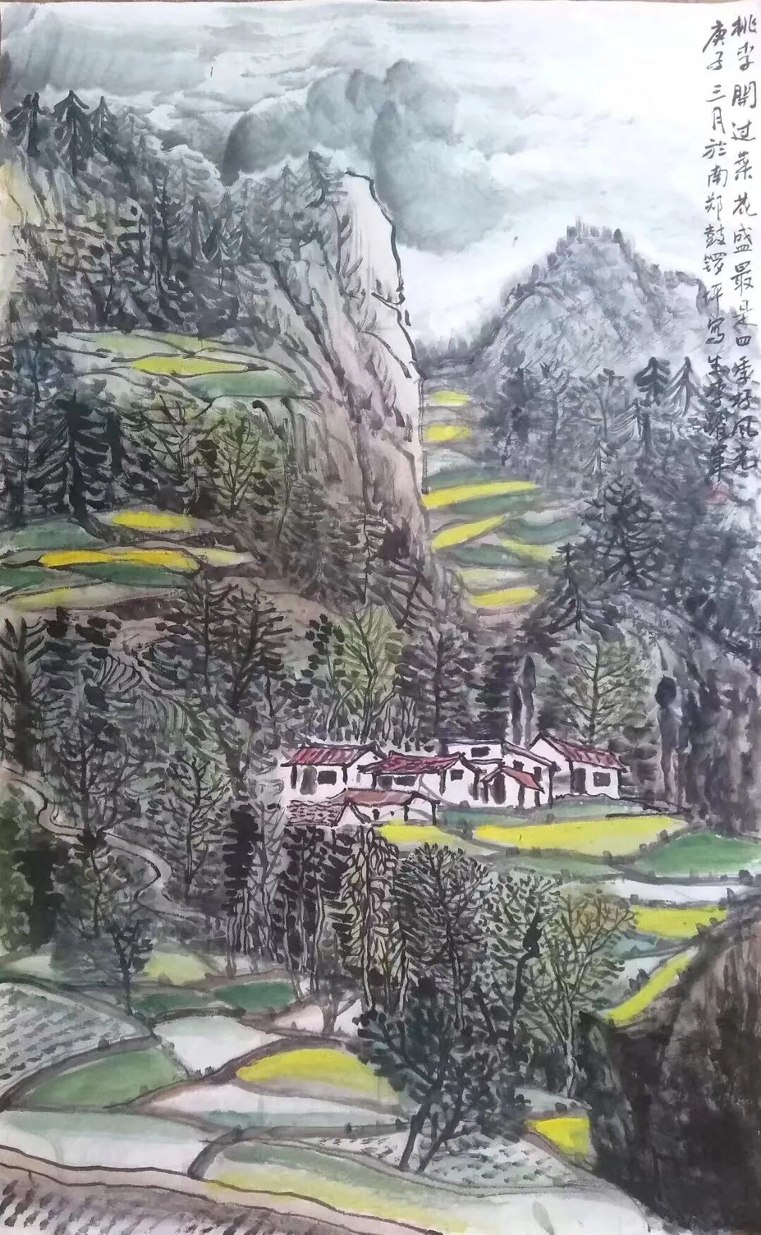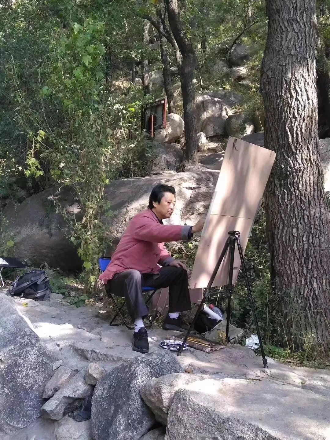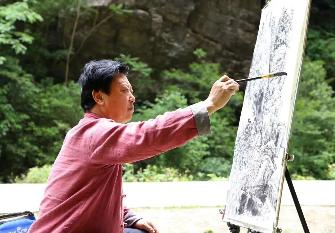 在欢呼雀跃的人群中,有一位身着绛色唐装,气度不凡,显得十分沉静的男士。在一处缓坡地,他忽然停下脚步,放下背上的包袱,利索的支起画夹,面对不远处的田野村舍,席地而坐,开始描画起来。噢,原来,这支踏青团队里,还有一位画家!同行的汉台区文联主席马俊惠,见我一脸疑惑,便介绍到:他叫李跃军,是新当选的汉台区美协主 席……