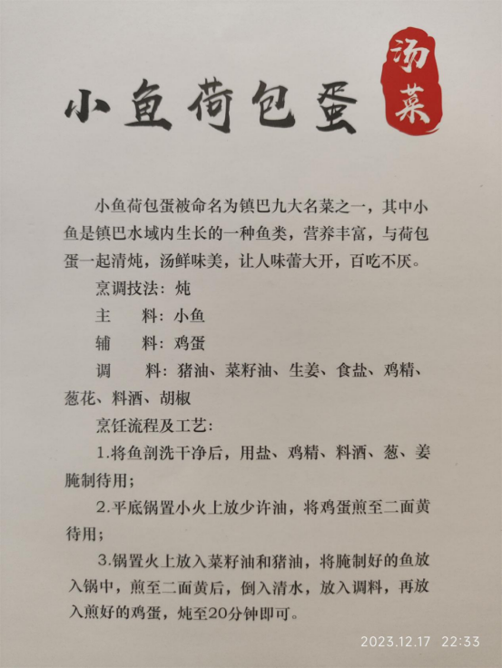 本文单独要推介的就是“镇巴九大名菜”之一的“小鱼荷包蛋”。俗话说,吃四条腿的不如吃两条腿的(鸡禽),吃两条腿的不如吃没有腿的(鱼类)。鸡蛋与小鱼的搭配,其营养价值,无需多言,而且当下正是冬季进补的最好时节。