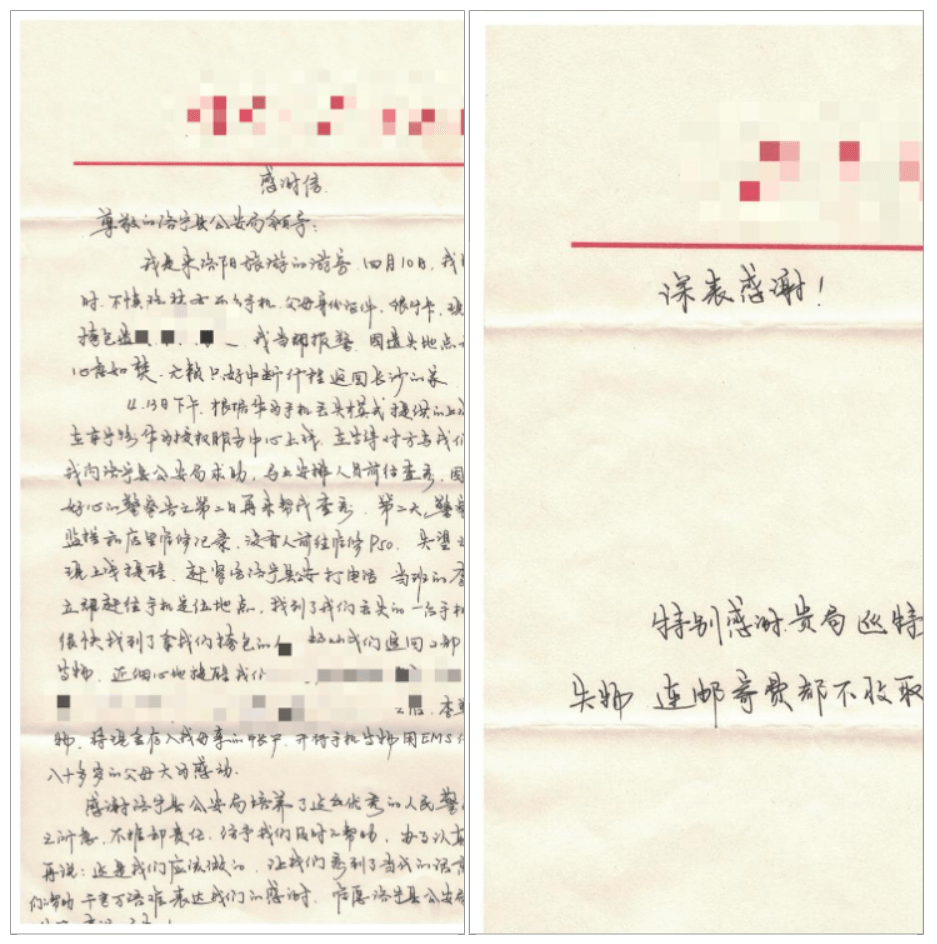 4月17日上午,一封来自湖南长沙饱含深情的感谢信邮寄到洛宁县公安局,特别感谢巡特警大队民警帮其找回了遗失的两部手机、现金、银行卡等贵重物品。