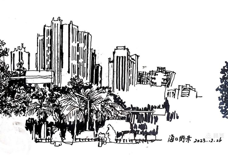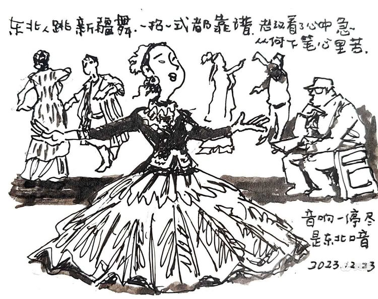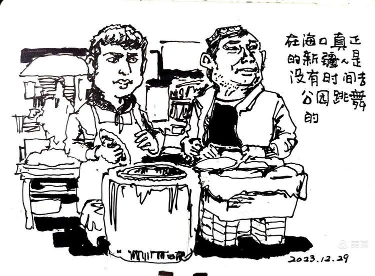 东北人跳新疆舞,一招一式很靠谱。老汉看了干着急,如何下笔心中苦。在海口公园里画速写有感。