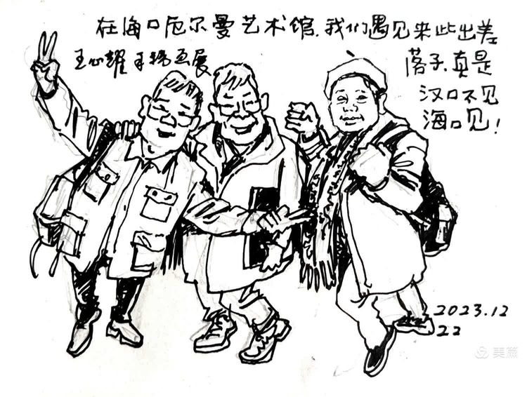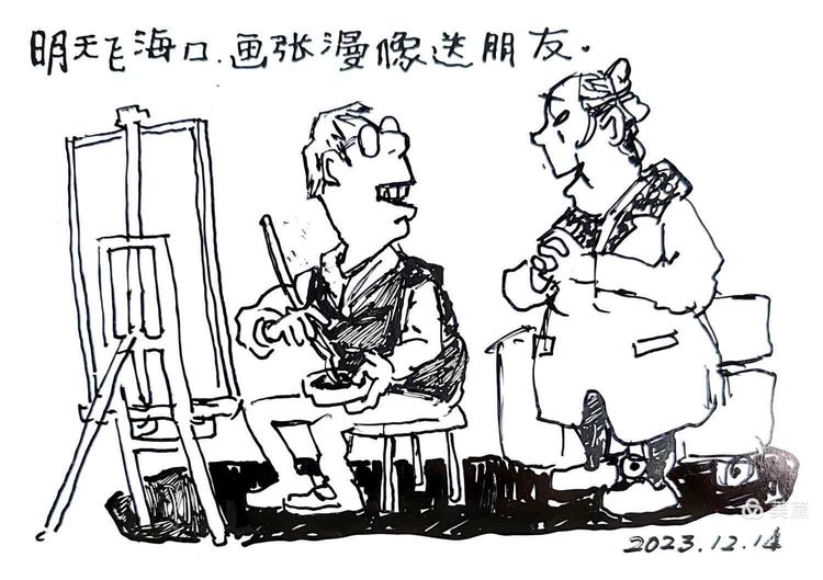 与外地画家交流,总不能是空手。我是画漫画的,就给认识的画家画张漫像相赠。