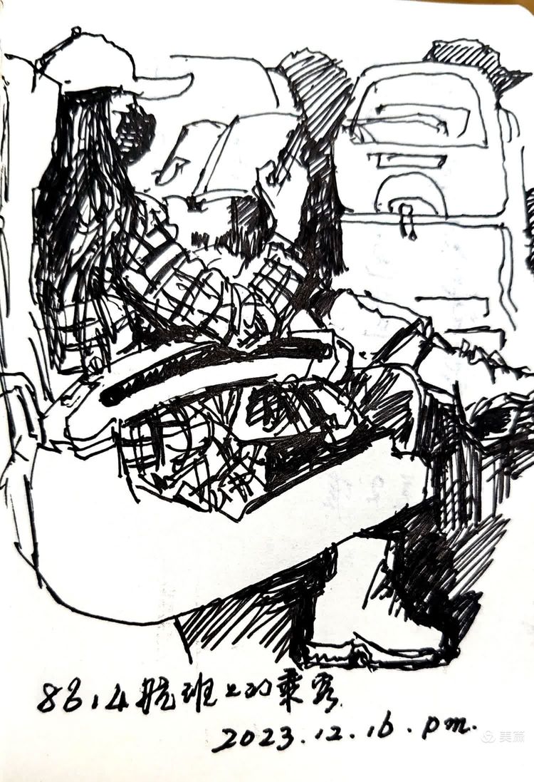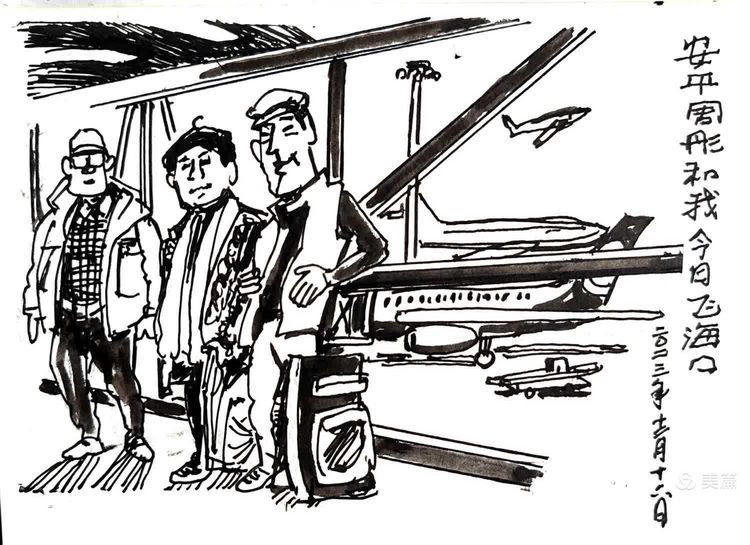 我们买的是最佳时间的航班机票,票价当然要贵一些。飞机上基本上客满。我的朋友们在看“艾派”,我在画速写,两个小时的航程很快就结束了。