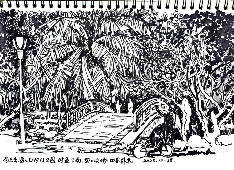 我们是傍晚的飞机,上午还可以在公园里潇洒一下,我给82岁的老年舞者画了一张人像速写,他高兴得不得了,在我的画上签名,一起合影,有朋友把我们扭秧歌舞姿也录了下来。