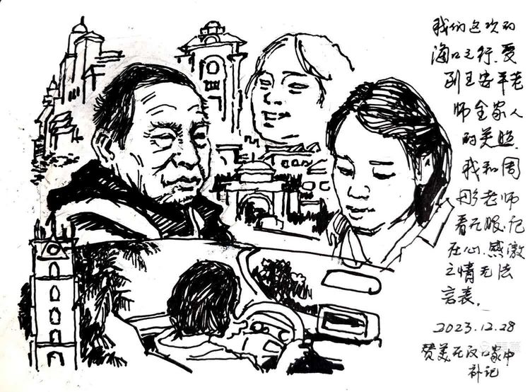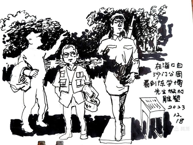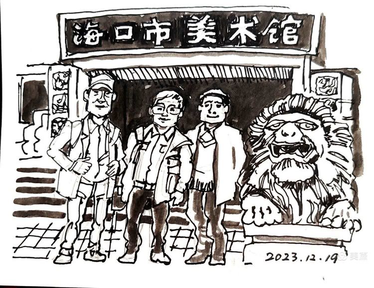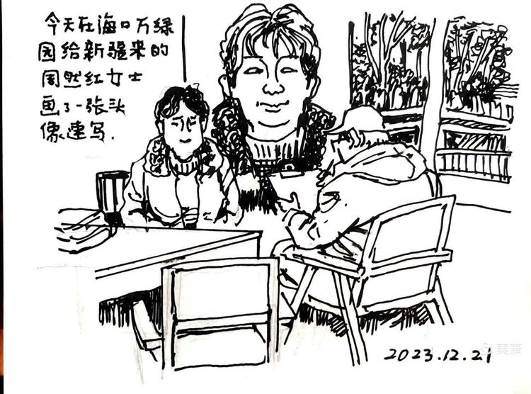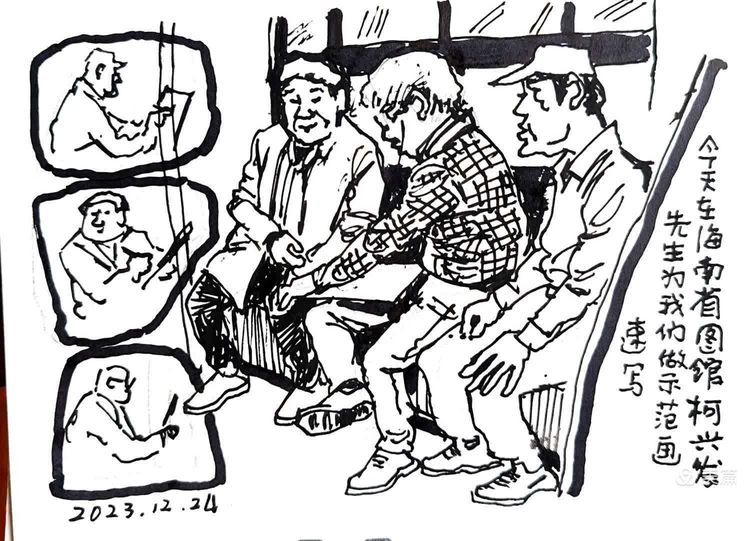 今日到海南省图书馆拜访当地的画家柯兴发先生,他是画速写的大家,给我们三个人各画了一张人像速写。并且赠送我一本他本人的水墨人物画集。