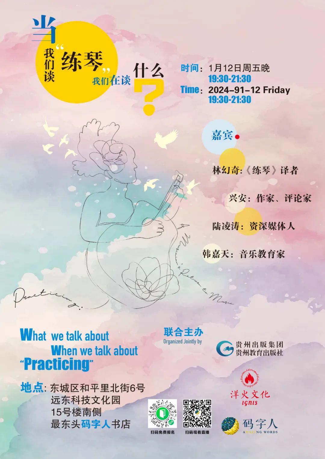 1.12周五晚,新书《练琴》译者林幻奇将带着他的吉他来到码字人书店,和作家、评论家兴安,资深媒体人陆凌涛,音乐教育家韩嘉天一同聊聊“练琴”的故事,对谈之后还有现场演奏以及读者交流。