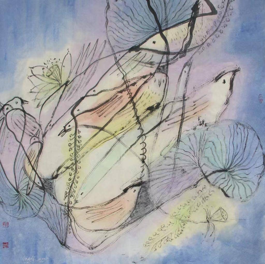荷韵.68x68cm.宣纸.墨.丙烯色.2022