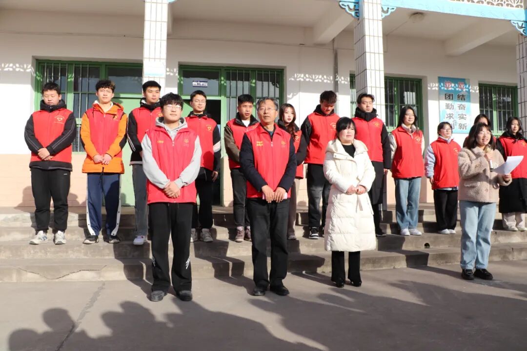 活动仪式由吴村小学英语老师赵丹丹(前排右一)主持,吴村小学校长文玉会(前排右二)、小桔灯公益负责人郭恩伟(前排左二)、陕西财经职业技术学院瑾瑜爱心服务队负责人马伯瑜(前排左一)等13名志愿者和吴村小学70余名师生们参加了活动仪式。