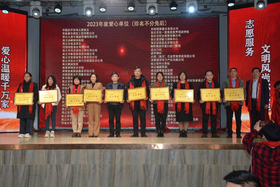在扶危济困和志愿服务活动中,涌现出了一大批勇于担当、乐于奉献的先进集体和先进个人。博爱联合会监事长曾超宣读了《关于表彰2023年度先进集体和先进个人的决定》。授予张韧“特殊贡献奖”荣誉称号;授予中国好声音商丘旗舰店等57个单位“爱心单位” 荣誉称号;授予赵金花等8人“突出贡献奖”荣誉称号;授予肖春瑶等22人“优秀会员”荣誉称号;授予李保玲等22人“优秀志愿者”荣誉称号;授予河南日报社商丘分社等36个单位(个人)“最佳公益传播奖”荣誉称号;授予高乃越等68人“优秀小志愿者”荣誉称号;授予于爱平等29人、商都舞韵舞团等4个单位 “爱心奉献奖”荣誉称号。与会领导和嘉宾分别向获奖单位和个人颁发了匾牌和荣誉证书。