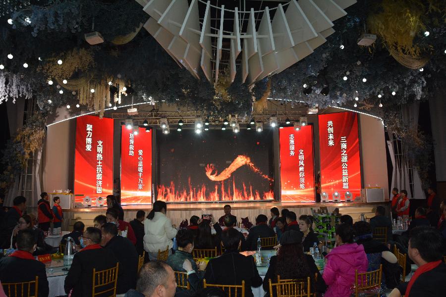 50多家爱心单位的红色祝贺条幅挂满了大厅西侧墙壁,舞台大屏上滚动播放着博爱人慈善救助、志愿服务的一张张照片和视频画面;到会人员共商慈善公益良策,共谋博爱发展大计,欢乐祥和,气氛热烈。开场舞《龙腾舞跃庆新年》拉开了年会的序幕。