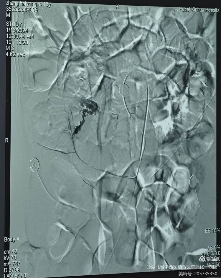 急诊腹腔动脉造影术:肠系上动脉回肠动脉分支“蚯蚓状”血管畸形并可见造影剂明显外溢,考虑小肠出血可能。