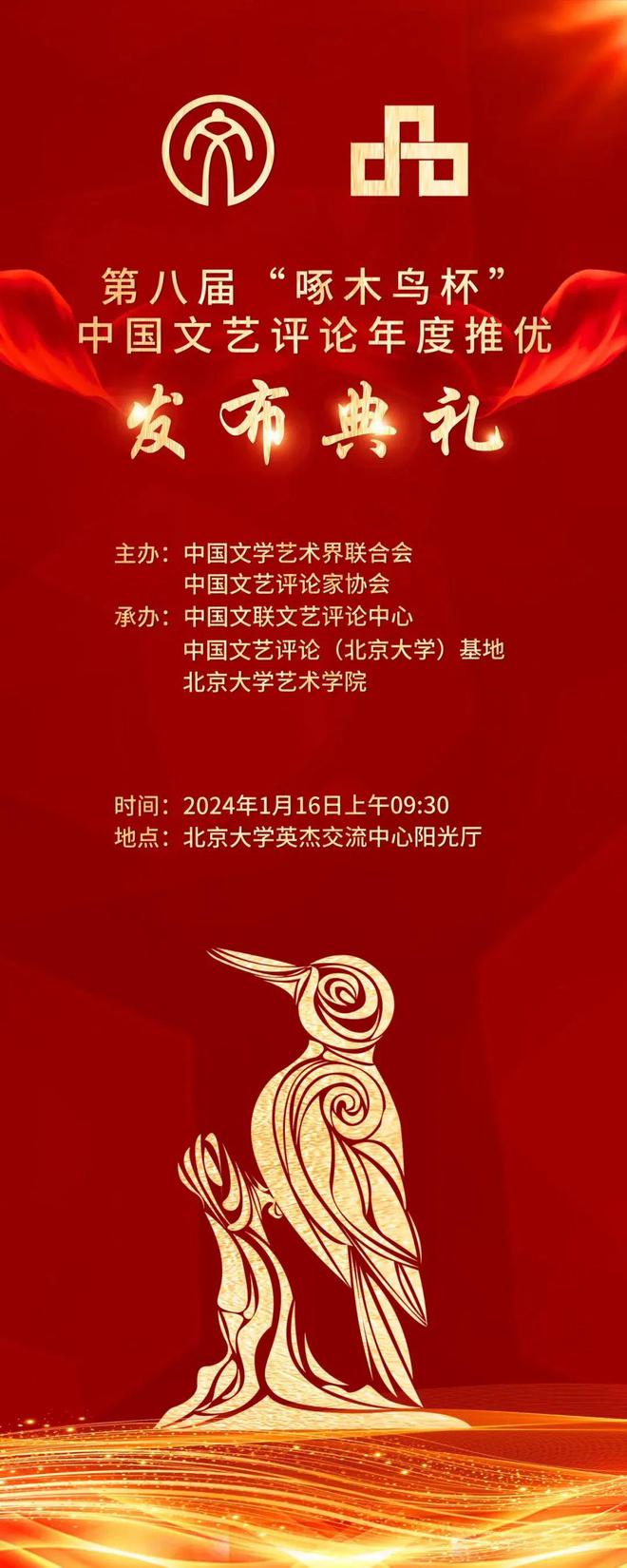 1月16日,由中国文联、中国文艺评论家协会主办,中国文联文艺评论中心、中国文艺评论(北京大学)基地、北京大学艺术学院承办的第八届“啄木鸟杯”中国文艺评论推优发布典礼在北京大学举行。