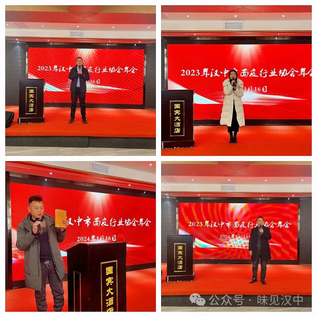 江南油脂总经理刘玉恒、陕西双亚周大黑有机食品汉中直营店负责人方戎、汉中市春泽粮油有限公司贾荣兵、黄官黄酒销售代表等分别致辞,祝贺2024年汉中市面皮行业协会年会圆满成功!
